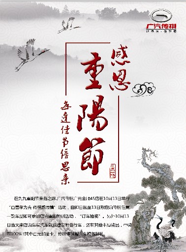 重陽節(jié),中國農(nóng)歷九月九日,為傳統(tǒng)的重陽節(jié)。在九九重陽節(jié)來臨之際,廣汽傳祺廣元金順4S店在10月13日舉行“百善孝為先 傳祺感恩情”活動,自即日起至13日期定購傳祺任意一款車型即可參加店內(nèi)重陽特別活動,“訂車抽獎”。另外10月13日當(dāng)天來店購車買汽車就送捷安特自行車,還有其他豐厚獎品,中獎率100%!!其中百元加油卡、傳祺棒球帽、車模等好禮 。咨詢熱線:0839-3568666,地址:廣汽傳祺廣元金順4S店。