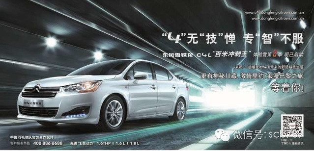 紅燈堵車還耗著油?不服! 才剛起步就被超車?不服! 霧霾重重擔心出門?不服! ……… 沒關系!參加東風雪鐵龍C4L“百米沖刺王”第二季體驗營,體驗C4L豐富的人性化智能技術, 就可以“4”無“技”憚,!爸恰辈环 ! 更有肆無忌憚的私奔之旅——穿越川藏!激情里約。±寺屠瑁。!…… 高性能高端中級車——東風雪鐵龍C4L,啟動,向前的力量!