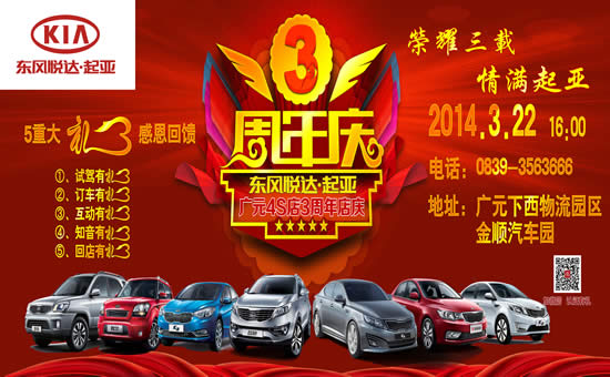 2014年3月22日16:00,東風(fēng)悅達(dá)·起亞廣元金悅順4S店3周年慶典將于東風(fēng)悅達(dá)·起亞展廳舉行,歡迎各位尊敬的顧客光臨!