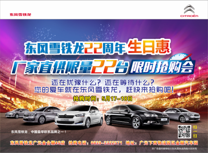在品牌22周年之際,東風雪鐵龍誠邀您參加“生日惠”。驚喜多多,優(yōu)惠不斷,讓你輕輕松松買到實惠好車。不管你是鐘情高端大氣的C5,還是起步就有的C4L,或是時尚動感的全新世嘉,亦或是經(jīng)過600萬KM+嚴苛路段考驗的全新愛麗舍,絕對讓你滿意而歸。當天,總部特供每店22臺車限量搶售,賣一臺少一臺,機會不可多得。