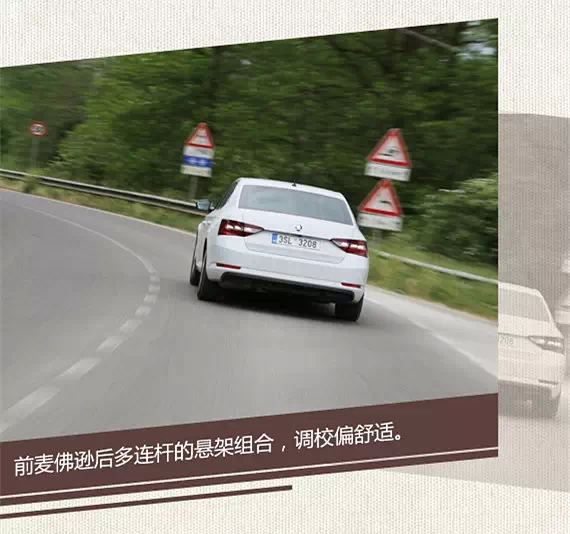 懸架采用前麥佛遜和后多連桿式的懸架組合,調(diào)教偏向舒適性,給人感覺相對(duì)較軟。不過懸掛在充分保證舒適度的前提下一點(diǎn)也不散,韌性和回彈力度都還不錯(cuò)。在有些顛簸的山村公路上,懸掛過濾掉了大部分的顛簸,但依然有著較清晰的路感。懸架偏向舒適調(diào)校也就意味著其過彎的支撐性會(huì)打些折扣,車輛在彎道上的側(cè)傾不小,但也在可以接受的范圍內(nèi),畢竟魚和熊掌不可兼得。不過想想速派是為捷克總統(tǒng)打造的車,再舒適也不為過了,甚至擁有一定的運(yùn)動(dòng)性能都會(huì)感覺知足。