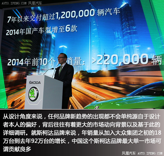 從設(shè)計(jì)角度來(lái)說(shuō),任何品牌新趨勢(shì)的出現(xiàn)都不會(huì)單純?cè)醋杂谠O(shè)計(jì)者本人的偏好,背后往往有著更大的市場(chǎng)動(dòng)向背景以及基于此的詳細(xì)調(diào)研。就斯柯達(dá)品牌來(lái)說(shuō),年銷量從加入大眾集團(tuán)之初的18萬(wàn)臺(tái)到去年92萬(wàn)臺(tái)的增長(zhǎng),中國(guó)這個(gè)斯柯達(dá)品牌最大單一市場(chǎng)可謂貢獻(xiàn)良多。