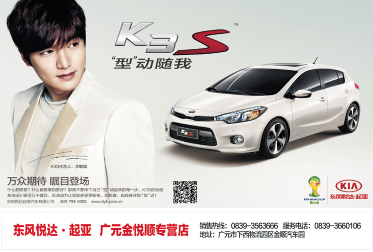 由長腿歐巴李敏鎬代言的K3S共有6款車型,車身擁有透明白、新雅藍、暗櫻紅等七種顏色,并提供全黑、黑米和黑棕三種內(nèi)飾風格,為消費者帶來豐富多彩的差異化選擇。K3S的目標人群是追求快樂、率性果敢、充滿自信且掌控自我的年輕一代,東風悅達起亞憑借對用戶訴求的敏銳洞察和精準把握,啟用韓國最具人氣的亞洲男神李敏鎬為代言人,他與同樣深具明星氣質(zhì)的K3S互相輝映且高度契合,勢必全面提升品牌號召力,掀起一場五門時尚車型的新風潮。據(jù)廠家代表介紹,選擇在XX地區(qū)區(qū)域上市,就是為了讓當?shù)叵M者能夠第一時間領(lǐng)略K3S全面越級的型動魅力,以表達企業(yè)對一直以來關(guān)心、支持東風悅達起亞的廣元地區(qū)車友的感激之情。