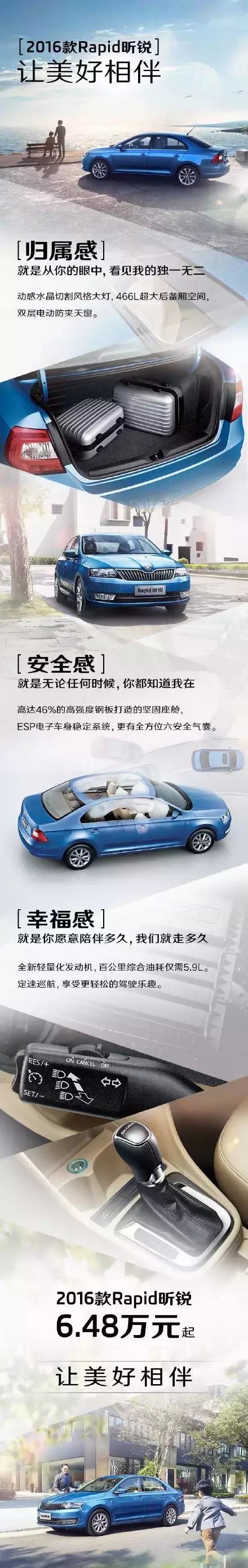 2016款Rapid昕銳,讓美好相伴!它營造1255L后備廂空間,給予你歸屬感;它全方位六安全氣囊,給予你安全感;它讓你享受更輕松的駕駛樂趣,給予你幸福感。2016款Rapid昕銳6.48萬起,相伴你左右。